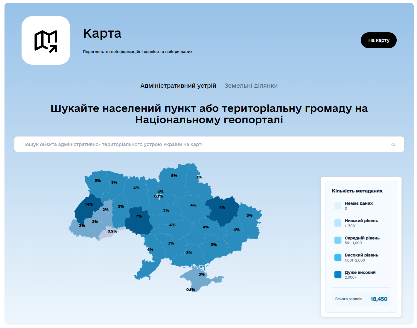 Блок містить кнопку для швидкого переходу на карту геопорталу, пошукове поле для адміністративно-територіальних одиниць, додаткову вкладку для переходу до пошуку земельних ділянок та інтерактивну карту, що демонструє кількості метаданих опублікованих для окремих областей з кількісним та відсотковим показником.