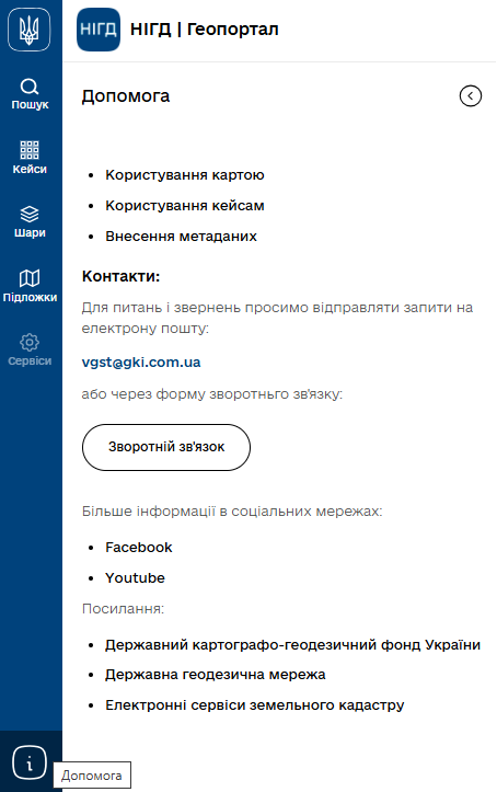 Повренутися на Головну сторінку геопорталу можна, клікнувши по пункту меню ліворуч з зображенням тризуба.