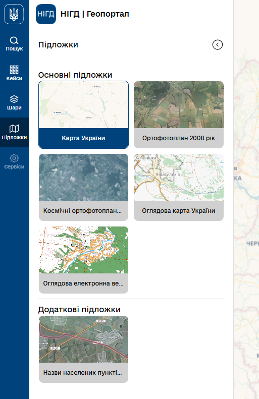 Розділ меню дозволяє перемикатися між доступними базовими картами Національного геопорталу, які використовуються фоновими для решти доступних на геопоратлі шарів даних.