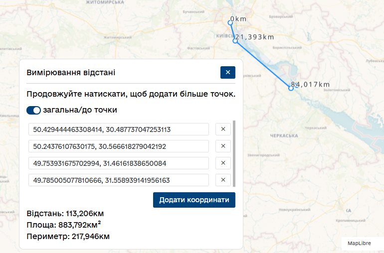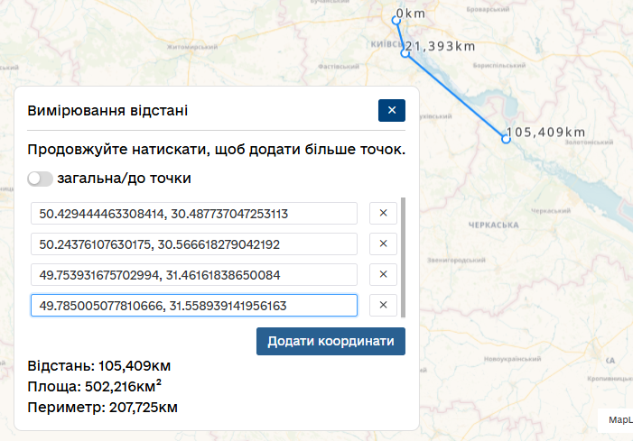 Вимірювання можна проводити і між довільними точками, обираючи на карті, і між конкретними точками додаючи їх координати в відповідне поле панелі вимірів.