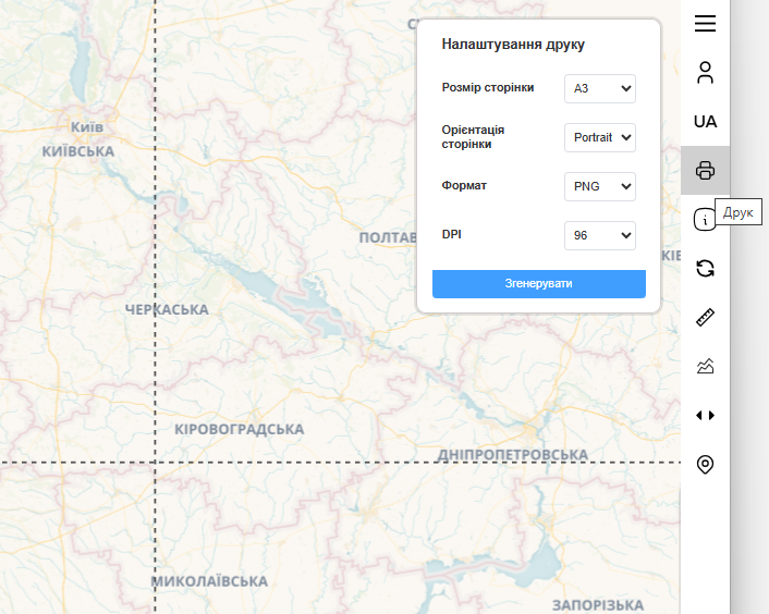 Панель друку дозволяє налаштувати стандартні формати розмірів сторінок для генерації файлу зображення фрагменту карти, зорієнтувати сторінку для друку, обрати бажаний формат файлів зображення (PNG,JPEG,PDF,SVG) та необхідну роздільну здатність від 96 до 400 DPI.